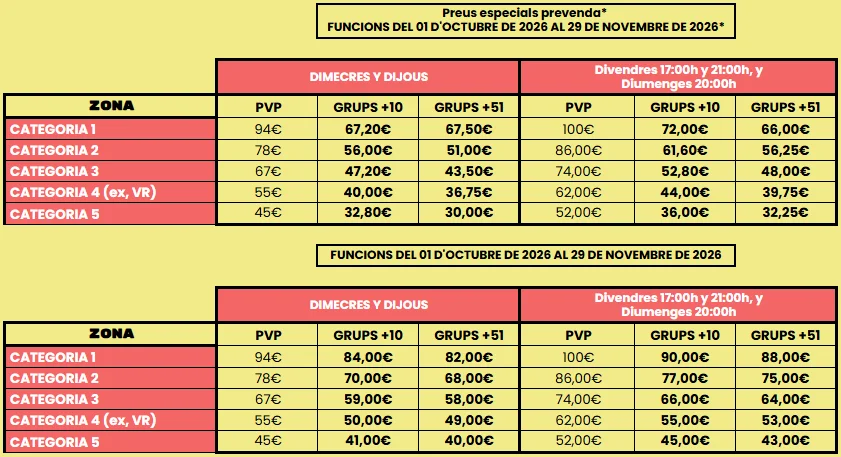 (El preu dependrà de les circumstàncies del grup i de la disponibilitat de les localitats. Preus de grups per a les funcions indicades en cada taula, excepte 4 i 5 de Desembre, període del 23 de desembre al 6 de gener i festius locals i nacionals de 2026. Tots aquests preus inclouen IVA i despeses de gestió.)